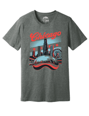 June is here, bringing the perfect chance to dive into Chicago’s outdoor fun. This shirt showcases the Bean front and center, along with the famous Chicago skyline and Navy Pier’s ferris wheel, all set against a backdrop of the Chicago flag.